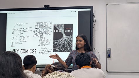 I was also moved by the work Jenia Mukherjee and Pratyasha Nath presented on Kolkata’s East Kolkata Wetlands: a vast, intricate ecosystem of wastewater, fisheries, and centuries of human ingenuity on the edge of the city. Pratyasha is telling this story through comics, which seem well suited to the subject. She is thinking about the gutters of comics, the spaces between the frames, as a metaphor for the actual gutters of Kolkata.
