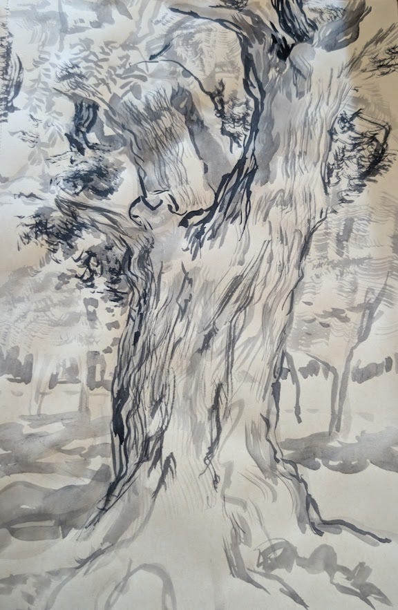 It’s one of the larger, older trees around. Lately, first thing in the morning, around 6:30 am, when the temperature is pleasant and people are out walking and enjoying the fresh air, I sit on a bench just opposite it and do my best to put what I’m noticing down on paper. It’s become a kind of modest anchor for my day.